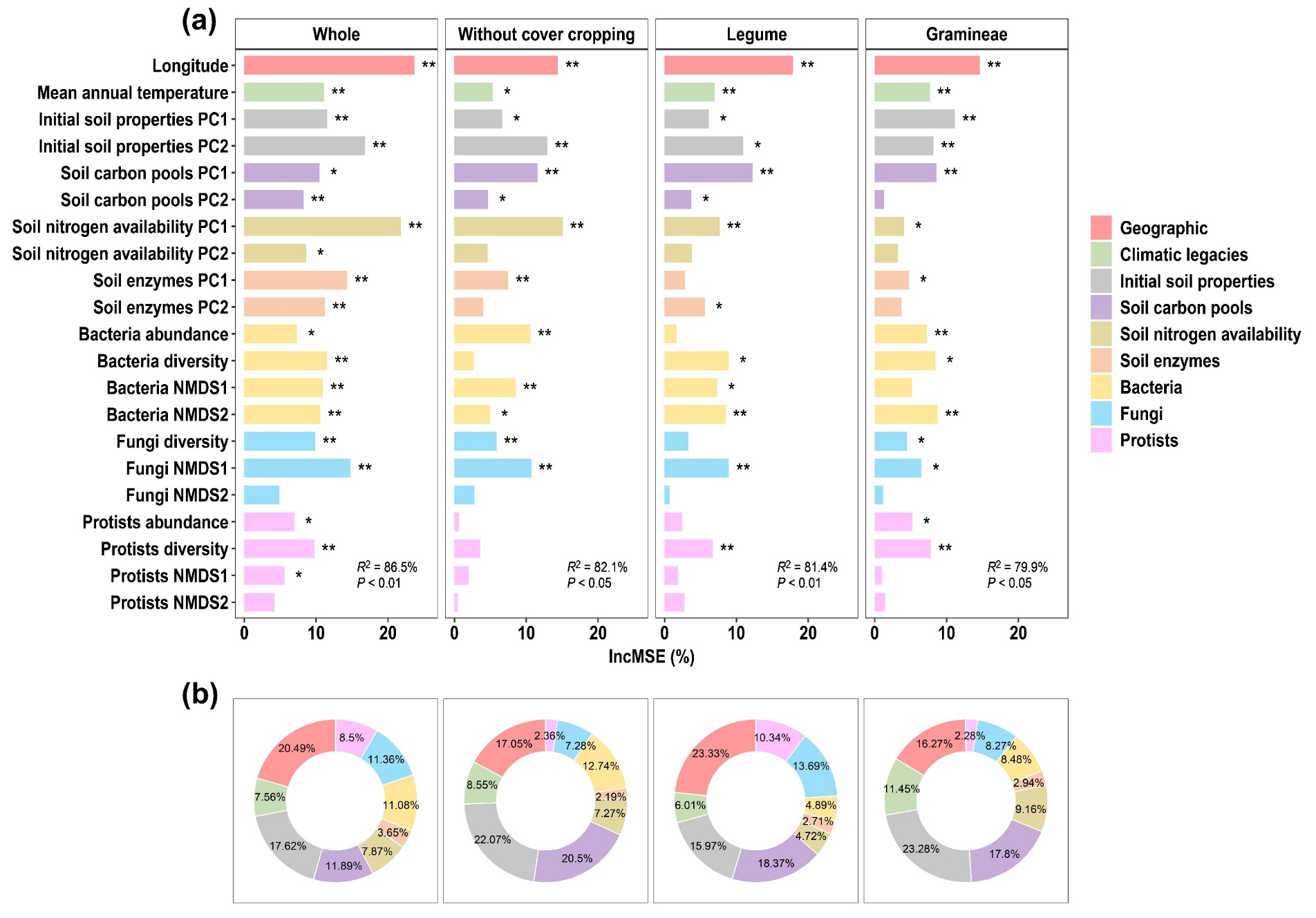 图2. 覆盖作物种植介导的生物和非生物因素对玉米生长的影响(盆栽试验)。(a) 随机森林模型(RF)显示了不同驱动因素在预测玉米生长方面的相对重要性。在随机森林模型中,均方误差百分比(IncMSE%)越高,表明特定因子的重要性越高。(b) 层次分割模型(HP)用于量化所有预测因子对玉米生长的独特贡献。选择第一主成分(PC1)和第二主成分(PC2)代表初始土壤特性、土壤有效性和土壤碳库的综合影响。微生物(细菌、真菌和原生生物)相对丰度、多样性和群落组成基于玉米相关 ASV 计算。微生物多样性以丰富度量化,而群落组成则通过基于布雷-柯蒂斯距离的非度量多维尺度(NMDS)分析的第一轴(NMDS1)和第二轴(NMDS2)进行表示。微生物相对丰度基于玉米相关 ASV 相对丰度的总和计算。
