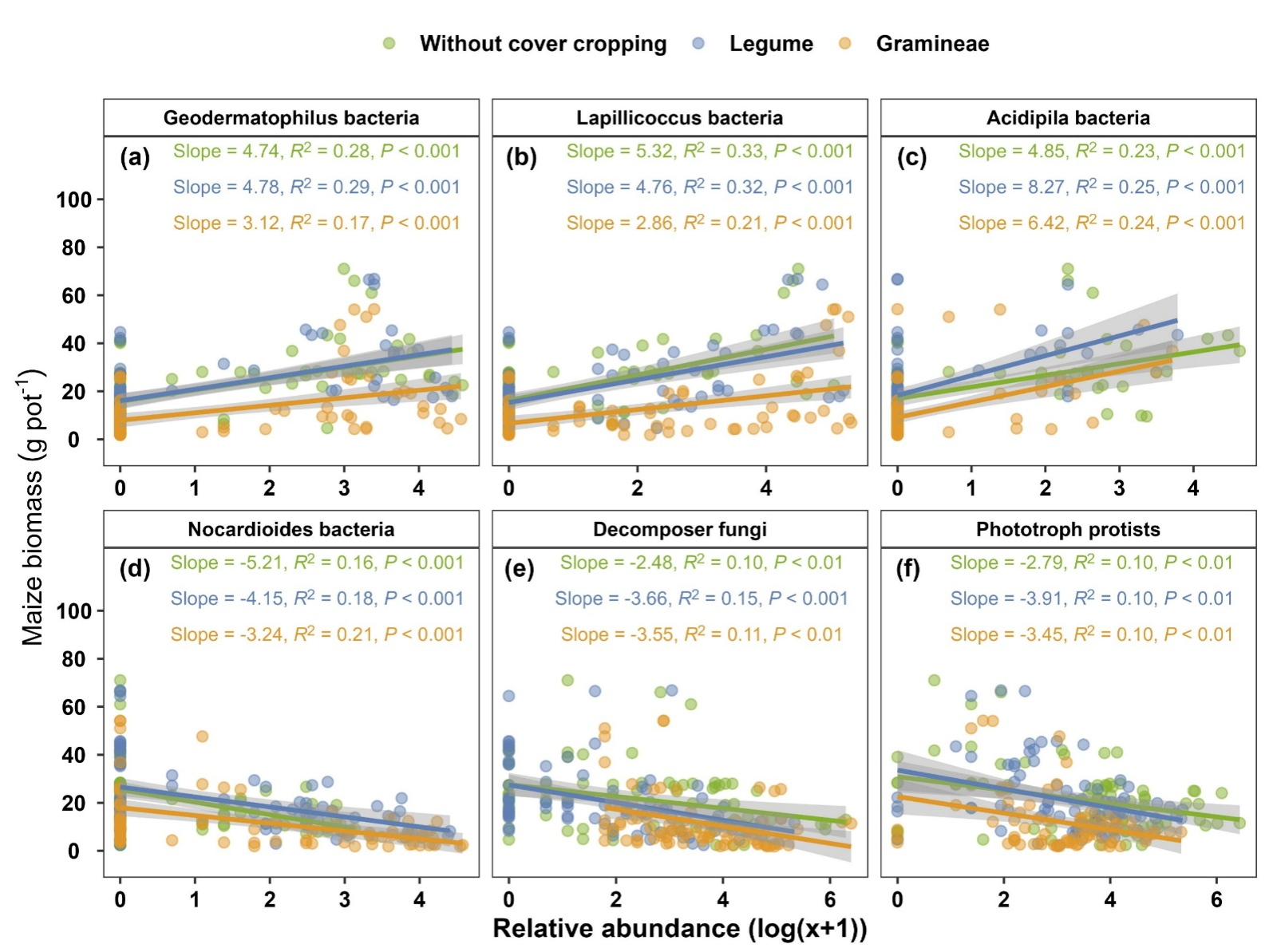 图3. 覆盖作物种植介导的土壤微生物类群与玉米生长的关系(盆栽试验)。(a-f)不同覆盖作物处理下土壤微生物类群与玉米生物量的线性回归分析。玉米生物量以总生物量表示。