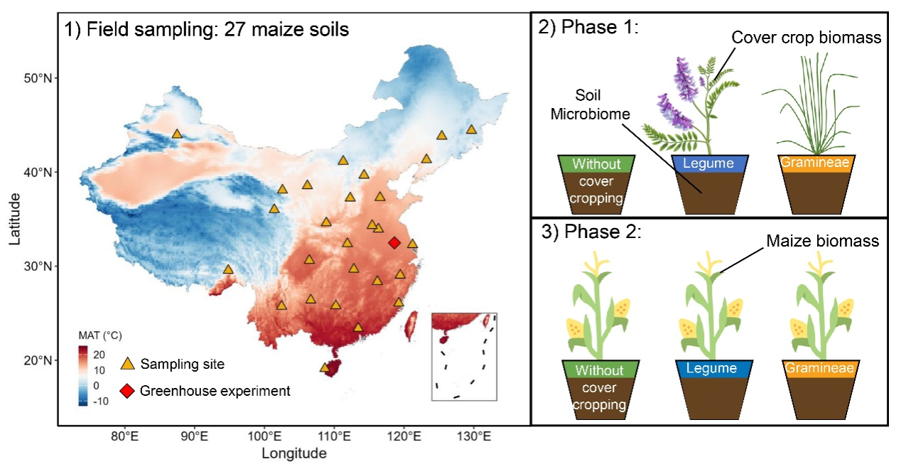 图1. 本研究的两步实验设计流程图。1)我国典型土壤的大尺度野外采样。通过采集中国不同区域的27份种植典型主作物(玉米)的土壤样品,涵盖了不同的气候和土壤条件。2)利用野外采集的土壤进行了温室盆栽实验第一阶段,并在花盆中种植两种典型覆盖作物,包括豆科光叶笤子(Vicia villosa Roth)和禾本科黑麦草(Lolium multiflorum Lam.)。在这一阶段,测量了土壤微生物、土壤酶活性、土壤碳库和氮素有效性。随后,使用相同花盆进行了温室盆栽实验第二阶段,通过种植主作物玉米,测量玉米生长的变化,包括地上生物量、地下生物量和总生物量。
