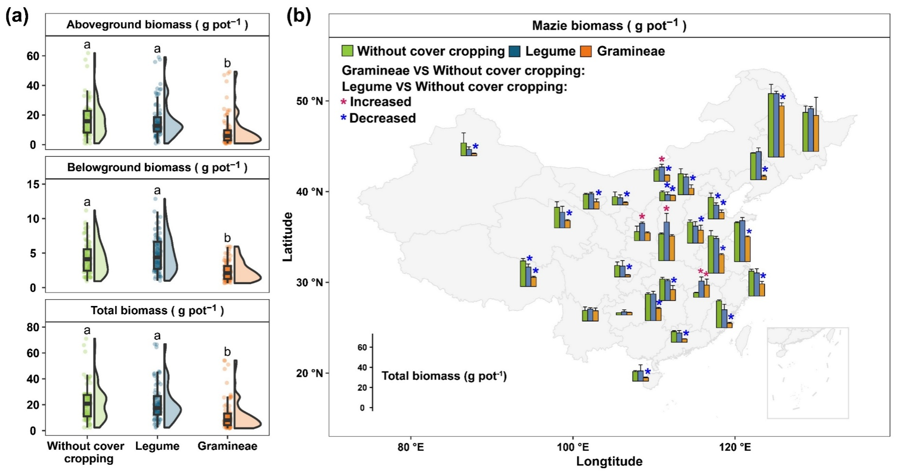图4. 覆盖作物种植对我国不同地点采集土壤中玉米生长的影响(盆栽试验)。(a) 线性混合模型(LMMs)显示了覆盖作物种植对玉米地上部生物量、地下部生物量和总生物量的影响。在这些模型中,覆盖作物被视为固定效应,而地点和花盆则被视为随机效应。箱线图中的水平线表示中位数,箱体部分表示第25百分位数和第75百分位数,须线则表示数据的最小值和最大值。(b) 线性混合模型(LMMs)显示了覆盖作物种植对27 个地点玉米生物量的影响。在这些模型中,覆盖作物被视为固定效应,而花盆被视为随机效应。玉米生物量以总生物量表示。数值以平均值 ± SE 表示。