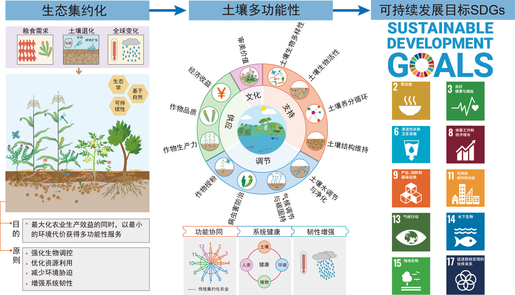 图1. 生态集约化通过提升土壤多功能性促进农业可持续发展的概念框架。