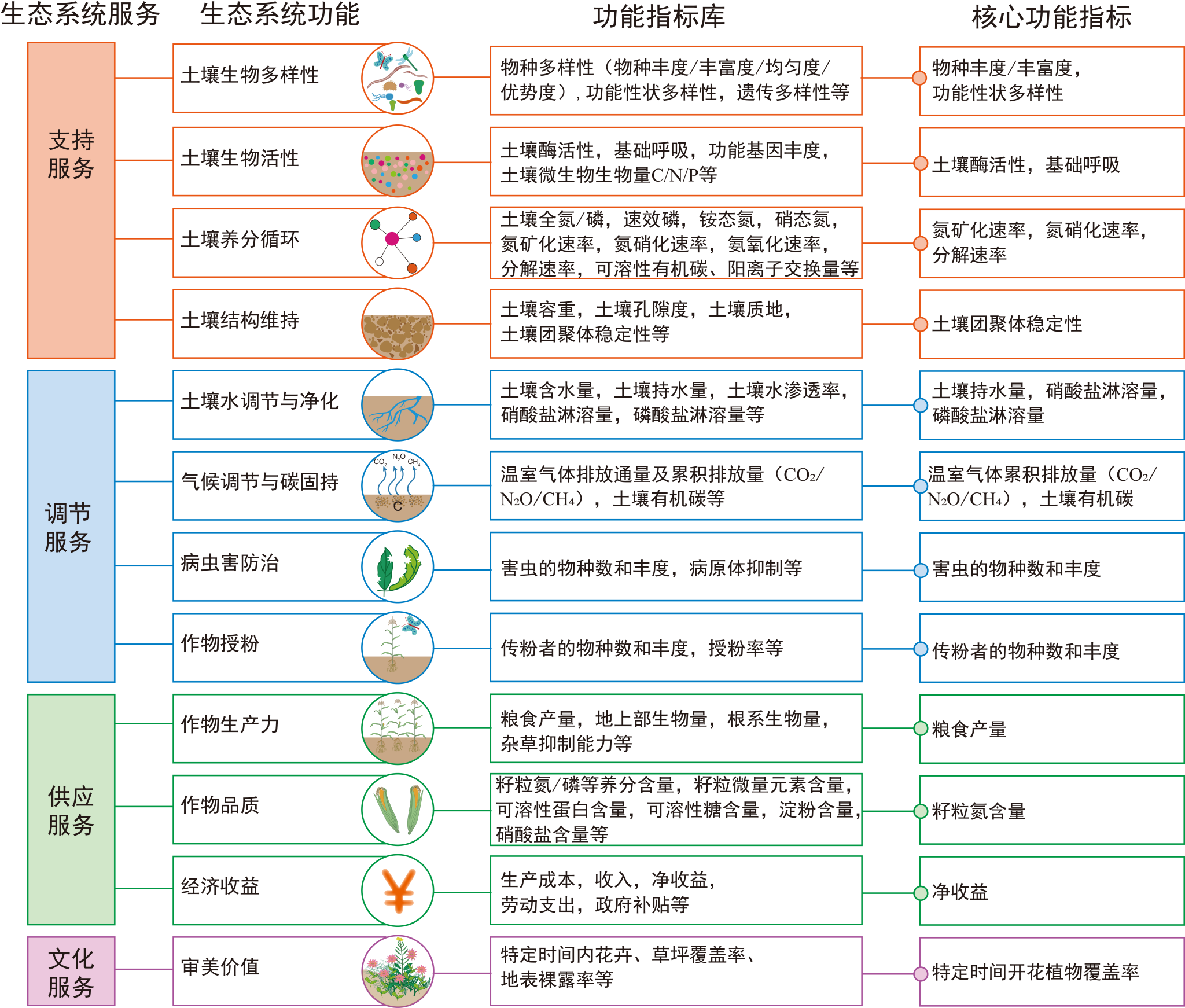 当前,生态集约化的深入推进面临三大挑战:土壤多功能性评价体系尚不完善,功能类型划分与指标体系构建缺乏统一标准;功能间协同与权衡关系认识不足,难以支撑多目标导向的农业管理;多措施协同的机制研究薄弱,尚缺乏适应不同区域环境条件的整合优化路径。针对这些挑战,本研究提出了系统化的应对策略:在评价体系方面,构建了涵盖支持、调节、供应与文化四大服务类型的土壤多功能性评价框架(图2),整合土壤生物多样性、气候调节与碳固持、作物品质等十二项核心功能,为农田生态系统多功能评价提供科学依据;在功能关系方面,针对生产与生态功能间突出的权衡关系,提出通过优化功能结构推动农业从“单一功能提升”向“系统功能协同”转变,建议未来构建基于功能网络的分析框架,解析多措施在时空维度上的协同机制,形成“协同最大化、权衡最小化”的优化路径;在多措施协同方面,强调从“措施叠加”向“系统配置”转变,通过强化理论构建与实证研究,识别功能互补型管理组合,建立因地因时、动态优化的技术体系。