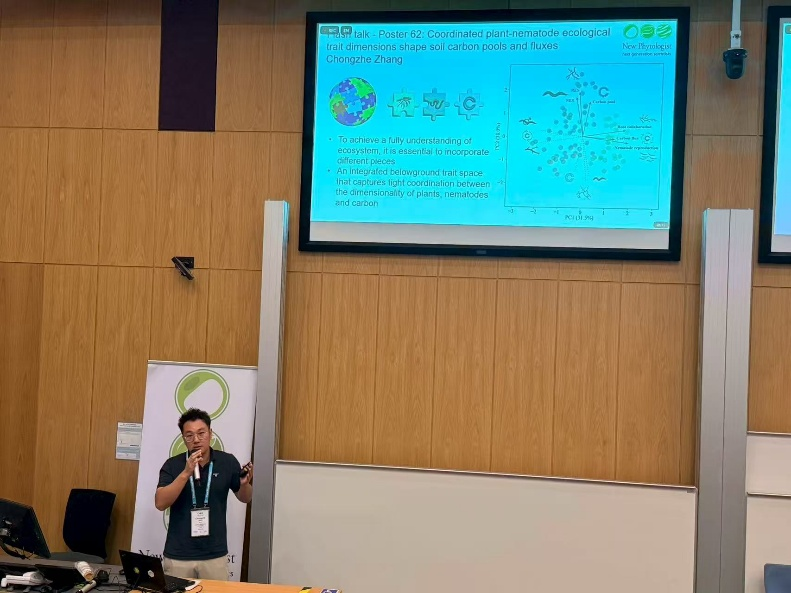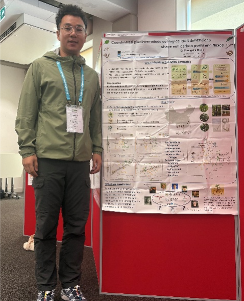 会议期间,张崇哲博士做了题为“Coordinated plant-nematode ecological trait dimensions shape soil carbon pools and fluxes”的Flash Talk和海报展示,介绍了其团队在定量化生态系统不同组分与功能在性状–策略维度上的协调关系方面的研究成果,揭示了植物与线虫生态策略的跨界协同及其与土壤碳循环的关联,并与来自世界各地的研究人员进行了深入交流,拓展了学术视野,收获了宝贵的科研思路、学术反馈与合作契机。